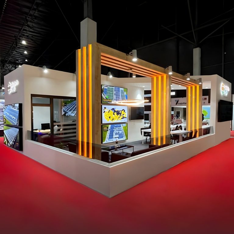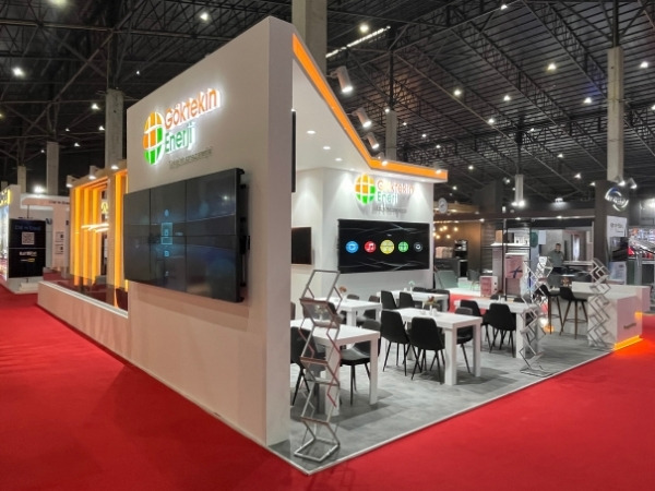 Göktekin Enerji için tasarlanan fuar standı, markanın yenilikçi karakterini modern bir tasarım diliyle buluşturdu. Dinamik çizgiler ve fonksiyonel alan kullanımı, hem estetik bir görünüm hem de konforlu bir ziyaretçi deneyimi oluşturdu. Detaylarda öne çıkan teknolojik dokunuşlar ise markanın çağdaş vizyonunu güçlü bir biçimde yansıttı.