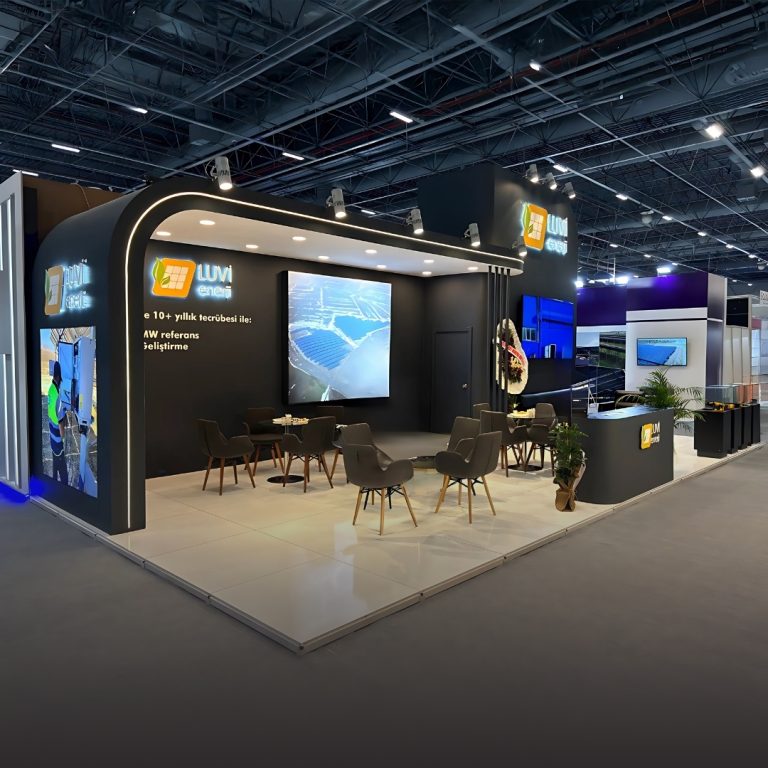 Luvi Enerji için hazırlanan fuar standı, modern tasarım dokusu ve kendine özgü mimari yaklaşımıyla öne çıktı. Estetik unsurlarla desteklenmiş alan planlaması, markanın sektördeki yenilikçi bakış açısını ziyaretçilere güçlü ve akılda kalıcı bir deneyimle aktardı.